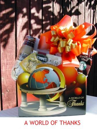 Show your appreciation with a basket of Starbucks Frappuccino, and WolfGang Puck's coffee, chocolate truffle and caramel praline gourmet hot cocoa, lemon or oatmeal cookies. It's all wrapped up in our Designer 'World of Thanks box..all for just $ 36.95