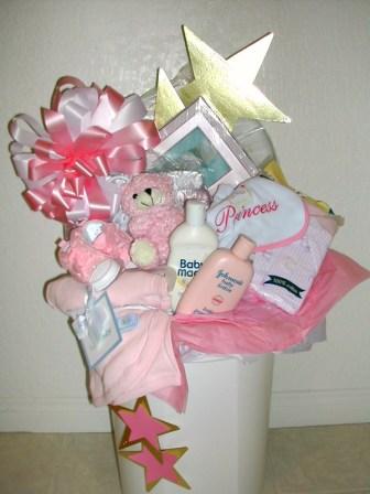 Celebrate the birth of this soon to be Rising Star in a manner befitting any young starlet with picture frames for head shots, Johnson's baby cream bath and lotion to prepare for the part, pink lace sneakers and a cute outfit forthe casting call, and cuddly warm blankets when it's a Wrap, add a diaper pail, bubblegum cigars, stuffed bear, bib, pink and gold cut out and A Star Is Born...$150... ...Also comes A Star is Born/ Blue or Yellow...To Order Call 310-774-6537