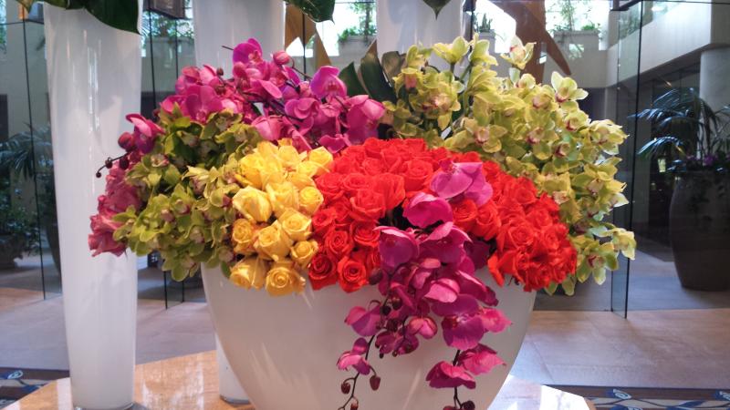 Learn to Create Breathtaking Floral Designs by Grouping Flowers in clusters and placing them high on top a Vase for an amazing Presentation (picture taken at Wynn Hotel, LV)
