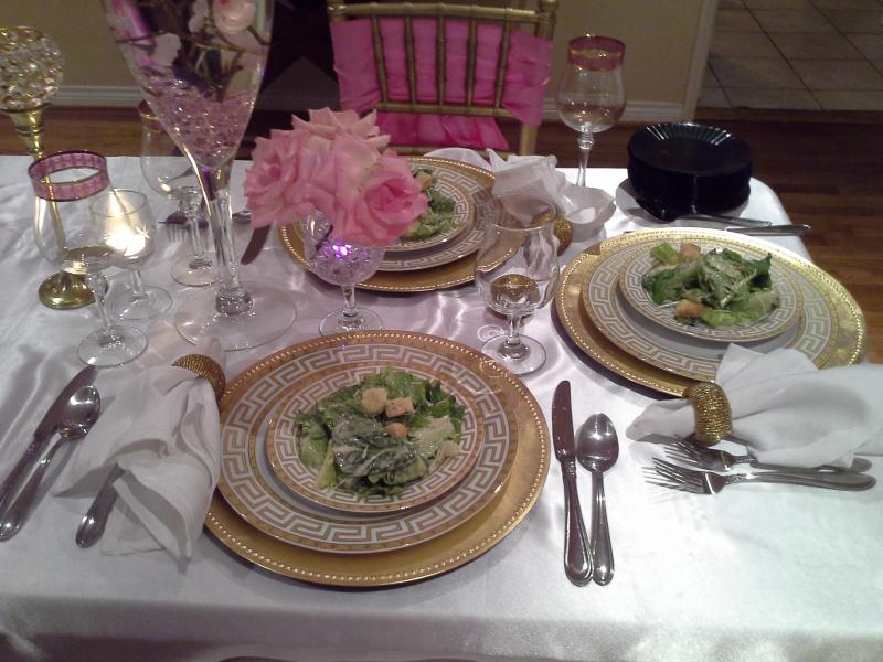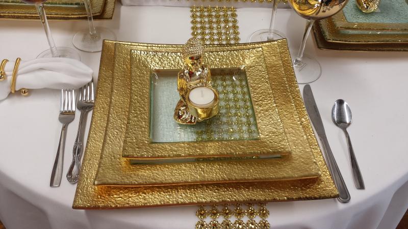 Adorn your guest dining tables with our 'gold plate charges' and/or 'gold beaded napkin rings'! Rental Prices start at only $1.50 (100 pc Min) For more information see our contact page.Gold Plate Charger is in the photo above.