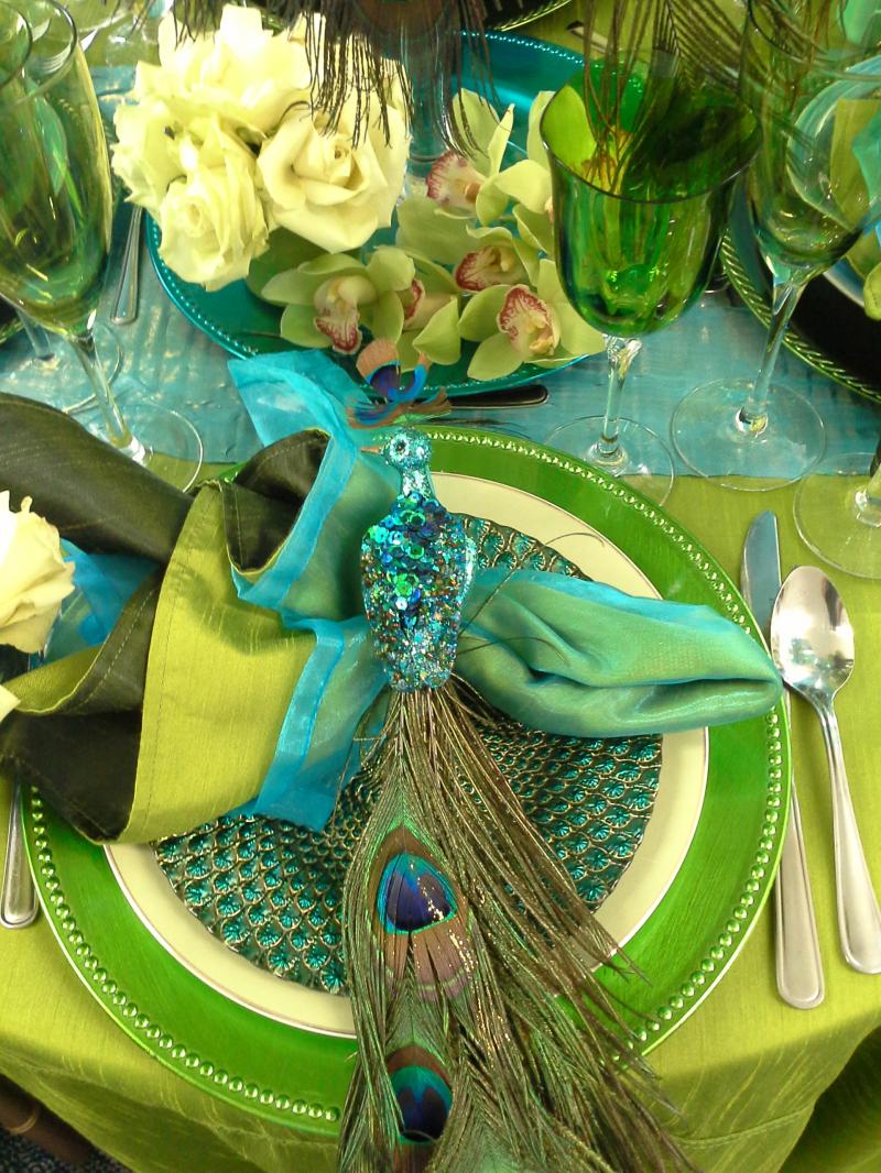 Learn How to Embellish Your Napkins like this Peacock Napkin Ring set on Blue Organza and Apple Green Raw Silk and placed on a matching Blue and Green Peacock Designed Place Setting