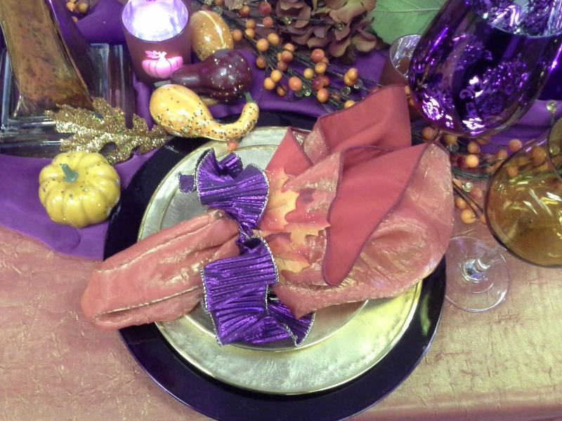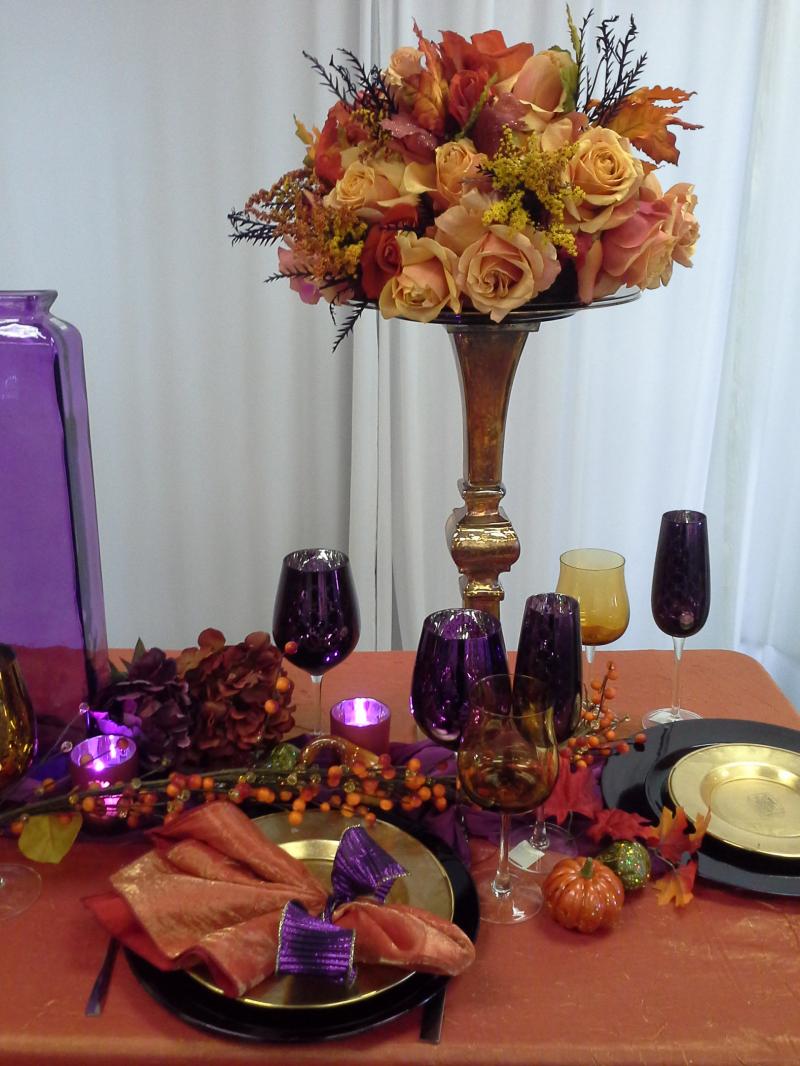 LEARN TO USE RICH JEWEL TONES LIKE THIS ORANGEY GOLD WITH BRONZE UNDERTONES AND TOPPED OFF WITH PASSIONATE PURPLE - FROM OUR NOVEMBER 7 TABLESETTING CLASS - DON'T MISS THE 2020 SEASON - IT STARTS SATURDAY, April 25, 2020...AND DON'T MISS OUR NEW FLORAL DESIGN CLASSES STARTING IN THE FALL OF 2020