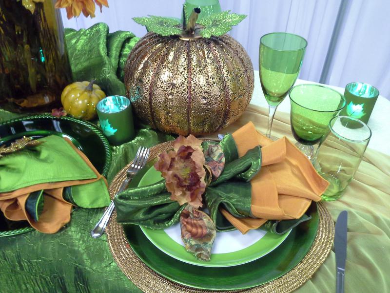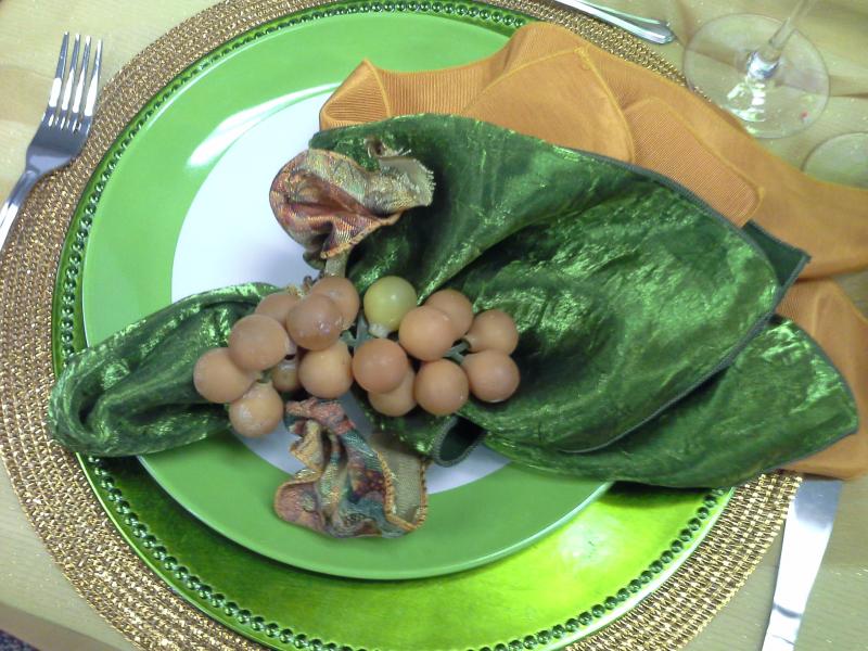 Here I used a Gold and Green Napkin to add Richness and Fullness to my Place Setting. It sits on top of a Green and White Plate with a Green Plate Charger Underneath, I added Green Stemware, and Green and Gold Candleholders which I bought at the 99cent store