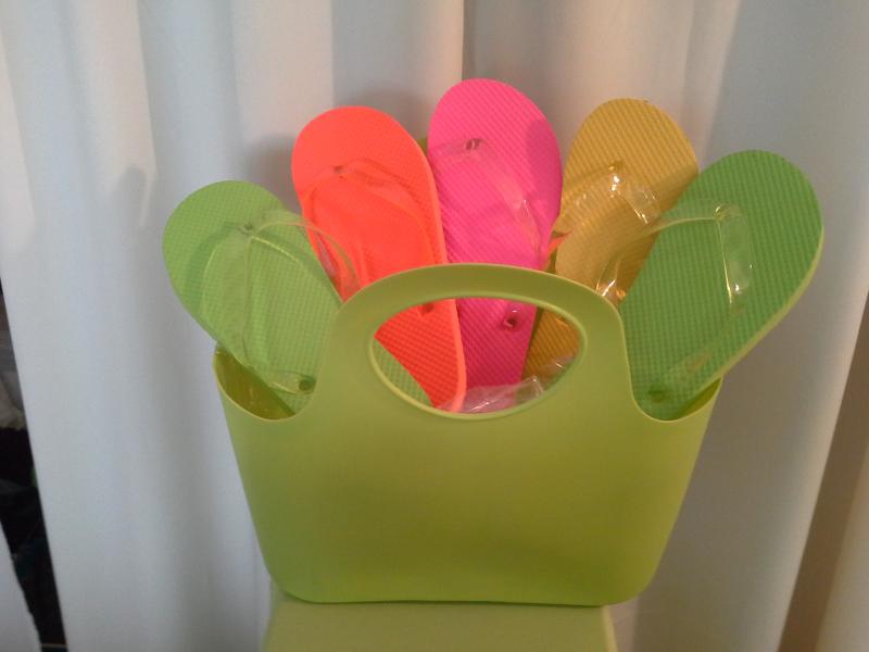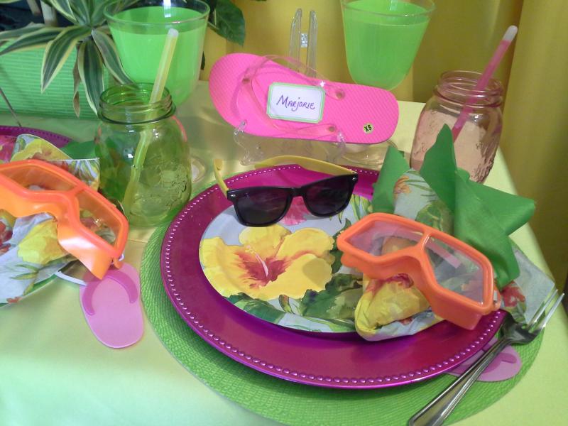The Orange Neon Colored Goggles is the Napkin Ring...and Flip Flop Sandal acts as a Place Card - When your guest leave they go to this Large Tote to find the matching sandle and take home a pair of Flip Flops as a Table Favor!!